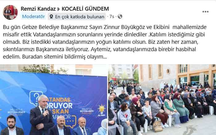 "Bu gün Gebze Belediye Başkanımız Sayın Zinnur Büyükgöz ve Ekibini mahallemizde misafir ettik Vatandaşlarımızın sorunlarını yerinde dinlediler .Katılım istediğimiz gibi olmadı. Biz istedikki vatandaşlarımızın yoğun katılımı olsun. Biz zaten her zaman, sıkıntılarımızı Başkanınıza iletiyoruz. Aytemiz, vatandaşlarımızda birebir hasbihal edelim. Buradan sitemini bildirmiş olayım..."
