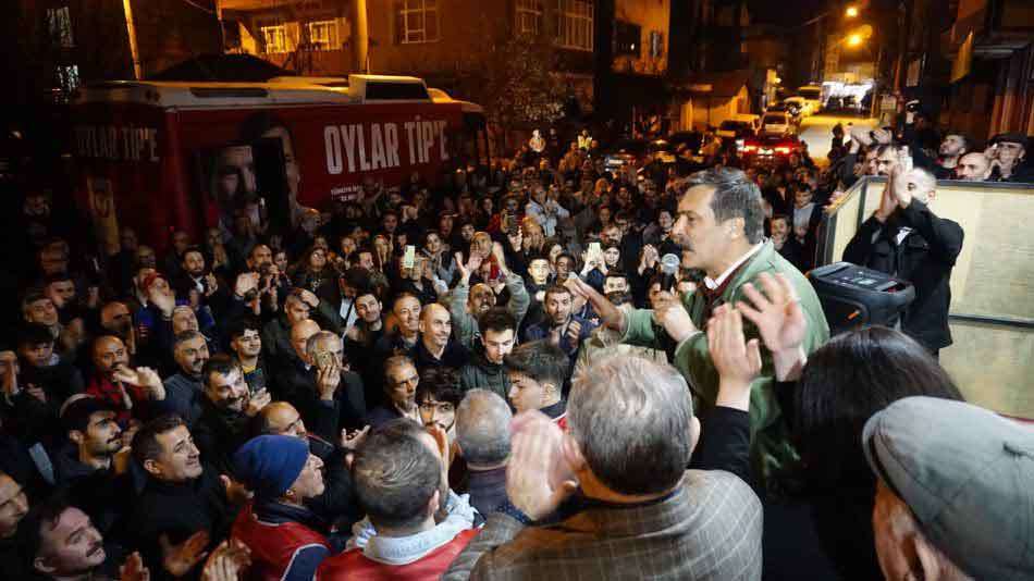 “Bunların elinde 2 silah var. İlki, kim onlara karşı çıkarsa ‘vatan haini’ diye yaftalıyorlar, hemen bir milli örtü ile kendi hırsızlıklarını, yolsuzluklarını saklamaya çalışıyorlar. İkincisi, bizi birbirimize düşürmeye çalışıyorlar. Kadını erkeğe, Türk’ü Kürt’e, Alevi’yi Sünni’ye, birbirine düşman etmeye çalışıyorlar. O yüzden biliyoruz, bir yerel seçime gidiyoruz ama bu seçime giderken şunu görmemiz lazım: Bu ülkede bozuk bir düzen var, bu düzen devam ettiği sürece, bizim mutlu olmamız, huzurlu olmamız çocuklarımızla geleceğe güvenle bakmamız mümkün değil. O yüzden ‘Değişim şart’ diyoruz, o yüzden ‘Bu bozuk düzen değişmelidir’ diyoruz. Dünyada servet artışının en yüksek olduğu ülke Türkiye. Tüm rakamlar gösteriyor, Türkiye zenginleşiyor, büyüyor, bizim alın terimizle büyüyor, bizim ürettiklerimizle zenginleşiyor. İçinizde zenginleşen var mı, tanıdığınız bizimle aynı işyerinde çalışan, aynı servise bindiğiniz zenginleşen kimse var mı? Ülke zenginleşirken biz zenginleşmiyorsak ne oluyor? Demek ki bu ülkede hırsızlar büyüyor, yandaşlar büyüyor, bizim iliğimizi kemirerek sömürerek, zenginleşiyorlar.