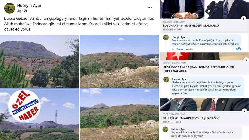 Hüseyin Ayar yine kocaelihaberi.com sitemizde yayınlanan Gebze belediye başkanı Zinnur Büyükgöz ile ilgili bir haberin facebook paylaşımının altına da “Sadece yer satmak değil İstanbul'un hafriyatı çöpü Gebze'ye para karşılığı dökülüyor bu rant gimlere gidiyor diye sormak lazım muhalefet partililer bunu gündem yapın lütfen” yorumunu yazdı..