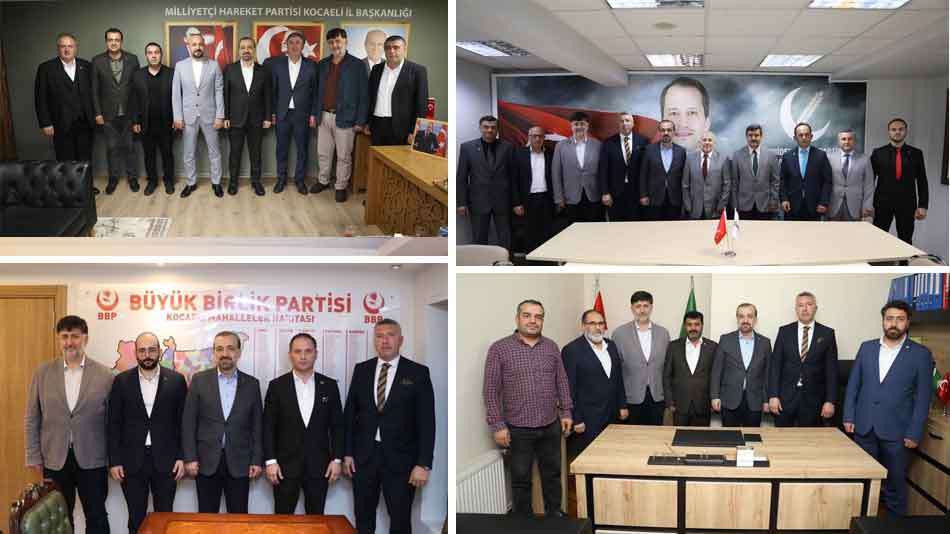 AK Parti Kocaeli İl Başkanı Dr.Şahin Talus, Cumhurbaşkanlığı ilk tur ve 2.tur seçimleri ile 28.Dönem Milletvekili Genel Seçimlerinin tamamlanmasının ardından Cumhur İttifakı ortağı il başkanlarını ziyaret etti. Milliyetçi Hareket Partisi Kocaeli İl Başkanı Murat Nuri Demirbaş ile teşekkür ziyaretlerine başlayan Talus, daha sonra Büyük Birlik Partisi Kocaeli İl Başkanı Kaan Şengil ve Kocaeli İl Koordinatörü Metehan Küpçü, Yeniden Refah Partisi Kocaeli İl Başkanı Ali Taştan, Demokratik Sol Parti İl Başkanı Halim Dedeoğlu, Hür Dava Partisi Kocaeli İl Başkanı Ali Çiftçioğlu ve yönetimleriyle bir araya geldi. Talus, yaptığı açıklamada, şunları söyledi: