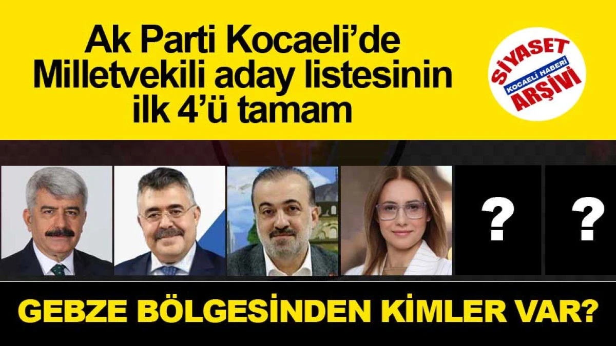 Ak Parti Kocaeli milletvekili aday listesinin 1 ve 2.inci sıralarında mevcut milletvekilleri Sadettin Hülagü ile Veysel Tipioğlu’nun yer almasına kesin gözle bakılırken, 3.üncü sırada Ak Parti Kocaeli il başkanı Şahin Talus ve 4.üncü sırada da Kocaeli Büyükşehir Belediye Başkan vekili Berna Abiş’e şans tanınıyor..