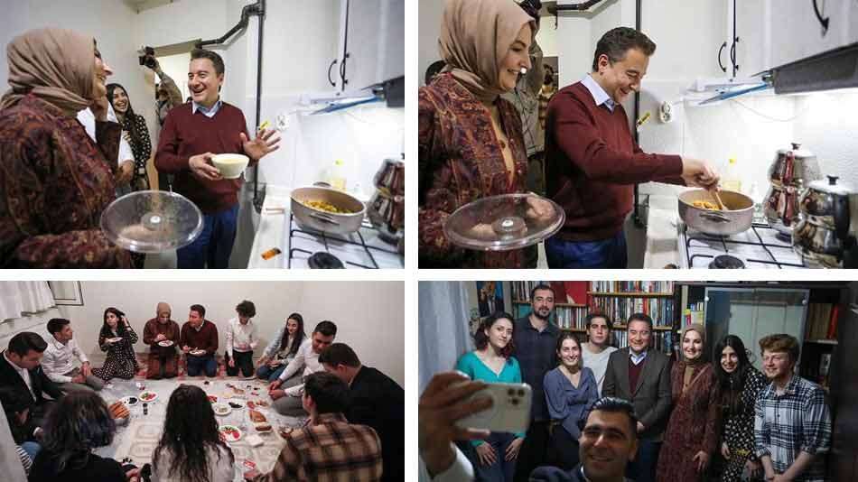 Öğrencilere sahur yemeği hazırlamak için mutfağa da girerek yemek hazırlayan Ali Babacan paylaşımında "Bugün iftardan sonra Zeynep’le birlikte üniversiteli arkadaşlarımıza misafir olduk. Uzun uzun sohbet ettik, fikir alışverişinde bulunduk. Gittiğimiz her evde bizi ağırlayan arkadaşlarıma teşekkür ediyorum." ifadelerine yer verdi..
