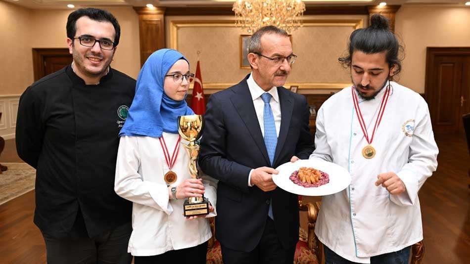 Sivas Cumhuriyet Üniversitesi tarafından 12-13 Mayıs 2022 tarihleri arasında düzenlenen üniversiteler arası “Anadolu’nun Mirası Soframda” isimli yemek yarışmasında 22 üniversite, 39 grup ve 71 öğrenci arasından Kocaeli’nin yöresel yemekleri ile tatlı kategorisinde “Otur Fatma” isimli tatlı ile birincilik elde eden Kocaeli Üniversitesi Turizm Fakültesi Gastronomi ve Mutfak Sanatları Bölümü öğrencileri Vali Seddar Yavuz’u ziyaret ettiler.
