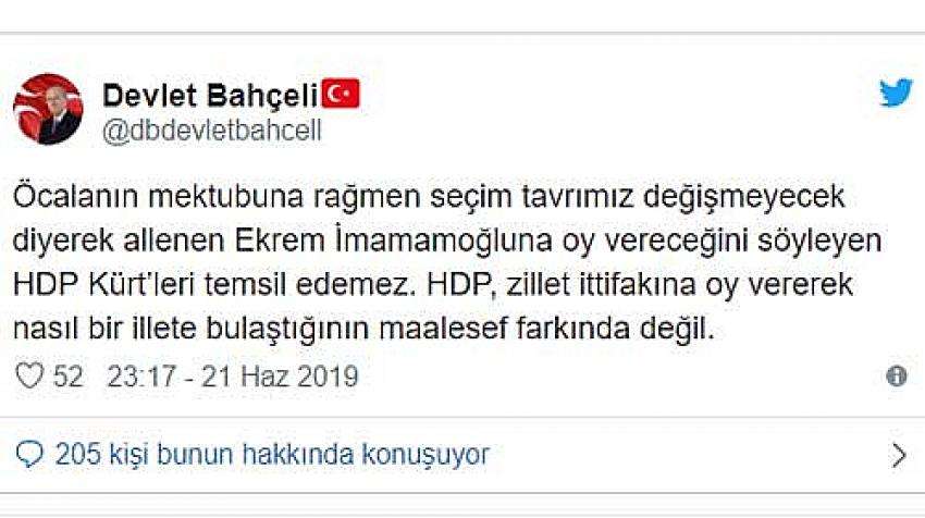 MHP Genel Başkanı Devlet Bahçeli, Terör Örgütü elebaşısı Abdullah Öcalan'ın mektubu ile ilgili olarak bu gece yarısı yaptığı twitter sayfasından açıklamada "Öcalanın mektubuna rağmen seçim tavrımız değişmeyecek diyerek allenen Ekrem İmamamoğluna oy vereceğini söyleyen HDP Kürt’leri temsil edemez. HDP, zillet ittifakına oy vererek nasıl bir illete bulaştığının maalesef farkında değil." dedi..