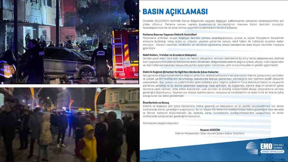 28 Aralık 2024 tarihinde Darıca’da meydan gelen doğalgaz patlaması sonrasında ilçede yapılan elektirik kesintileri vatandaşı mağdur edrken, Elektrik Mühendisleri Odası Kocaeli Şubesi Gebze Temsilcisi Baycan Aküzüm’den bir basın açıklaması geldi..