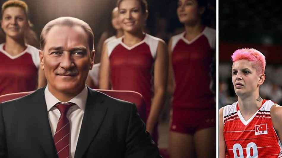 “Ey kahraman Türk kadını! Sen yerde sürünmeye değil, omuzlar üzerinde göklere yükselmeye layıksın” sözünün yer aldığı resimde, Atatürk'ün koltukta oturduğu ve arkasında ise A Milli Kadın Voleybol Takımı'ndan bazı isimlerin yer aldığı görüldü.