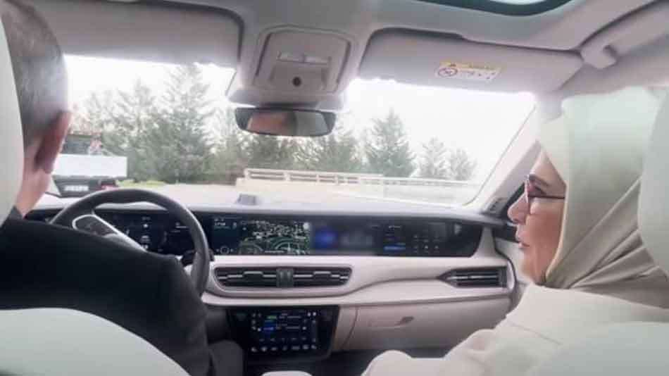 Sanayi ve Teknoloji Bakanı Mustafa Varank’ın da eşlik ettiği sürüş esnasında Emine Erdoğan’ın “Araba benim ona göre” demesi üzerine Cumhurbaşkanı Erdoğan’ın, “Kaptan benim şu anda, kaptana uyacaksın. Arabanın senin olması önemli değil, direksiyonda kim var önemli olan o” yanıtını vermesi gülüşmelere neden oldu.