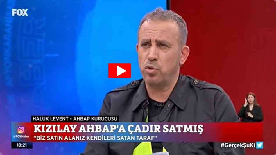 “AHBAP'ın Kızılay'dan çadır alma konusu hakkında konuşan Levent, "15 bin 250 adet çadır aldık. 20 bin 50’si Kızılay’dan alındı. 13 bin 200 tanesi de başka firmalardan alındı. 28 tanesinin faturasını yayın yayınlayacaktık zaten. Kızılay'da 2 bin 50 tane çadır vardı. 20 bin olsa satın alacağım. Ben o anda 'Kızılay oldu, toplum bize bir şey' diye düşünemem. İnsanlar ölüyor, eksi 10 derece. Sistemi kimse bilmiyor. AFAD da çadırları parayla, faturalı alıyor Kızılay’dan. Buyurun AFAD yetkilileri yalanlasın. Eğer o yurt dışına ihraç edilecek çadırlar satılacaksa, AFAD da parayla alıyor. Orada bir muhasebe var." dedi.