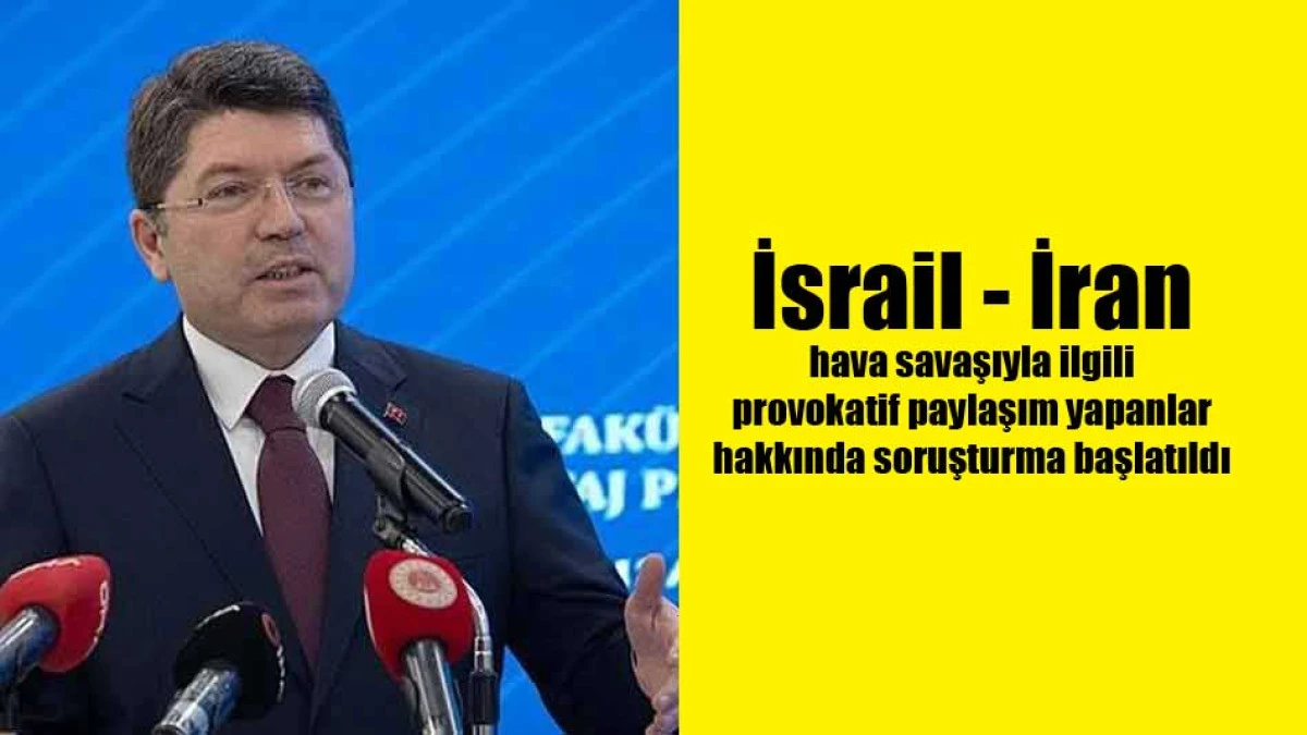 Adalet Bakanı Yılmaz Tunç, İsrail ile İran arasındaki hava savaşıyla ilgili kamuoyunu yanıltmaya yönelik dezenformasyon içeren ve toplumda infial uyandırma amacı taşıyan provokatif paylaşımlar yapıldığını belirterek, "Söz konusu paylaşımları yapan hesaplarla ilgili Ankara Cumhuriyet Başsavcılığı tarafından resen soruşturma başlatılmıştır" dedi