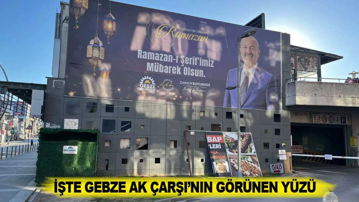 Delik deşik saç levhalarla çirkin bir şekilde dizayn edilmiş Ak Çarşı dükkanlarının yan duvarıın üstüne 20 Şubat 2026'da asılan Gebze Belediye Başkanı Zinnur Büyükgöz'ün, Ramazan ayını tebrik görseli, neredeyse Kurban Bayramı arefesine gelmemize rağmen halen kaldırılmamış ve asılı dururken, hemen altında yarsı paslanmış reklam tabelası üzerinde ne olduğu belli olmayan yarım reklam görselleri ve hemen yanıbaşında da yapay yeşil çimle kamufle edilmeye çalışılmış koca bir çöp konteynırı..