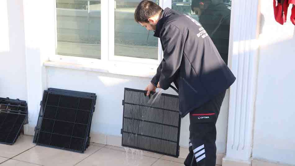 Park ve Bahçeler Dairesi Başkanlığı’na bağlı Enerji ve Aydınlatma Şube Müdürlüğü ekipleri, iklimlendirme cihazlarının fan bakımı, filtre değişimi, gaz ve basınç kontrolleri, havalandırma sistemi temizliği ve dış ünitelerin ilaçlı su ile temizliğini yapıyor. Vatandaşların daha sağlıklı bir ortamda eğitim ve etkinlik yapabilmesi için titizlikle sürdürülen bu çalışmalar, enerji verimliliğini de artırarak, çevre dostu bir yaklaşım sergilenmesini sağlıyor. Büyükşehir her alanda olduğu gibi, eğitim ve yaşam alanlarında da konforlu ve sağlıklı koşulların devamlılığını sağlamak adına cihazların bakımlarına devam ediyor.