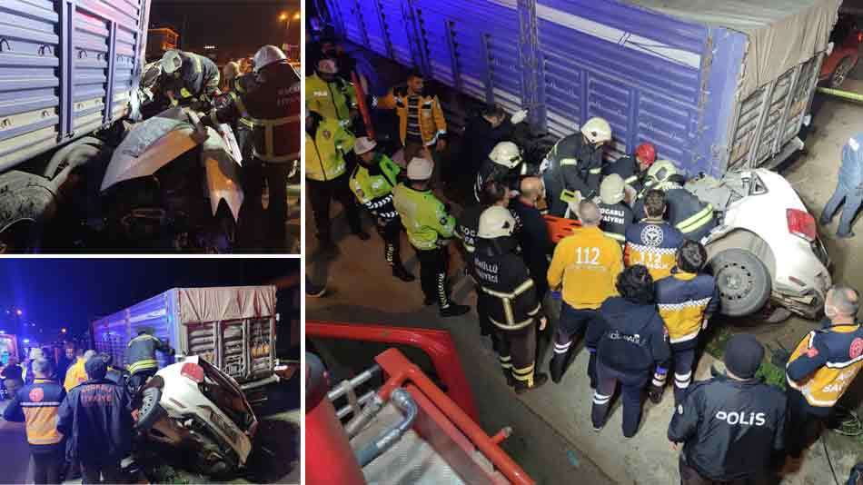İzmit Kandıra karayolu üzerinde seyir halinde olan 41 RR 510 plakalı otomobilin, yol kenarında park halinde bulunan kamyona çarpması sonucu meydan gelen feci trafik kazasında otomobilin içindeki 3 genç yaşamını yitirdi.  Otomobil sürsücüsü Ahmet Macit ve beraberindeki Sevban Tuna Sarı ve Emirhan Tural'ın hayatını kaybettiği kaza haberi, İzmit'te büyük bir üzüntü oluştururken kaza ihbarı üzerine üzerine olay yerine gelen Kocaeli Büyükşehir Belediyesi İtfaiye ekipleri kamyonun altına sıkışan otomobili uzun bir müdahale sonrası çıkarabildi. Polis ve sağlık ekiplerininde itfaiyenin müdahalesin eşlik ettiği kazada sürücü Ahmet Macit ile  Sevban Tuna Sarı ve Emirhan Tural kaza anında hayatını kaybetti. foto:Kocaeli İtfaiye 112
