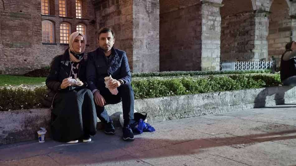 Cumhurbaşkane Recep Tayyip Erdoğan'ın kızı Sümeyye Erdoğan eşi Selçuk Bayraktar ile birlikte dün akşam önce Ayasofya camisini ziyaret ettiler ve akabinde akşam namazı ile birlikte caminin dışındaki kaldırım kenarına oturarak yanlarında getirdikleri ekmek arası, ayran ve suları ile iftarlarını açtılar..