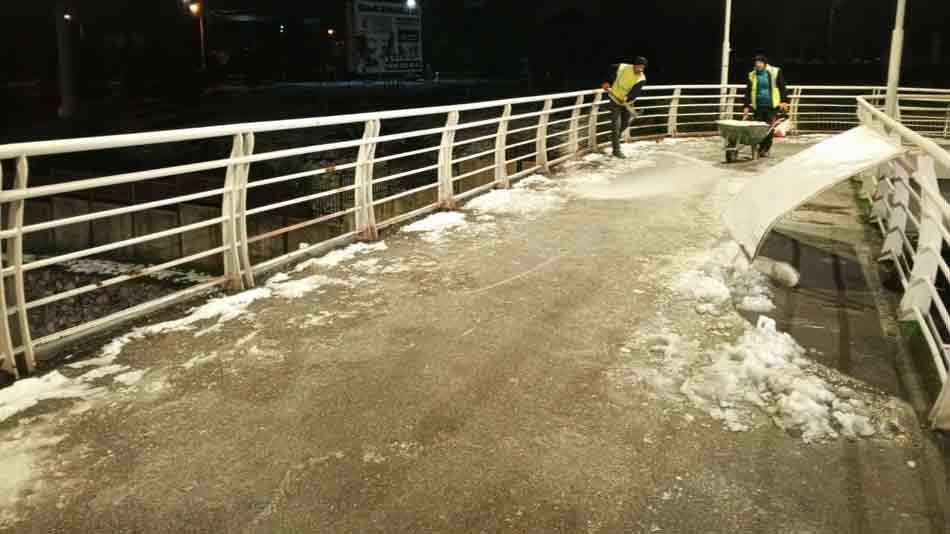 Büyükşehir Belediyesi, kar ve buzlanma nedeniyle Kocaeli genelinde özellikle üst geçitlerde kapsamlı ve özverili bir çalışma yürütüyor. Büyükşehir Yol Bakım Timleri ve A Takımından oluşturulan Karla Mücadele Ekipleri, 12 saatlik 2 vardiya halinde 7/24 buzlanmaya karşı kar küreme ve tuzlama çalışması gerçekleştiriyor.