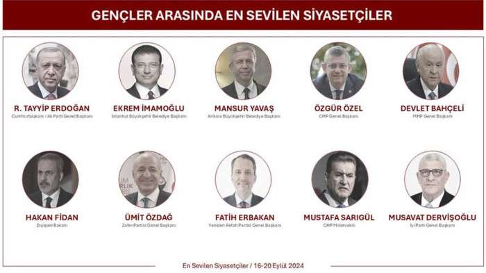 Verilere göre, ilk iki sırada Ak Partili Cumhurbaşkanı Erdoğan ve İstanbul Büyükşehir Belediye (İBB) Başkanı Ekrem İmamoğlu yer aldı. Listeye, gençlerin yanıtları doğrultusunda MHP Genel Başkanı Devlet Bahçeli, Dışişleri Bakanı Hakan Fidan ve Zafer Partisi Genel Başkanı Ümit Özdağ gibi isimler de girdi.