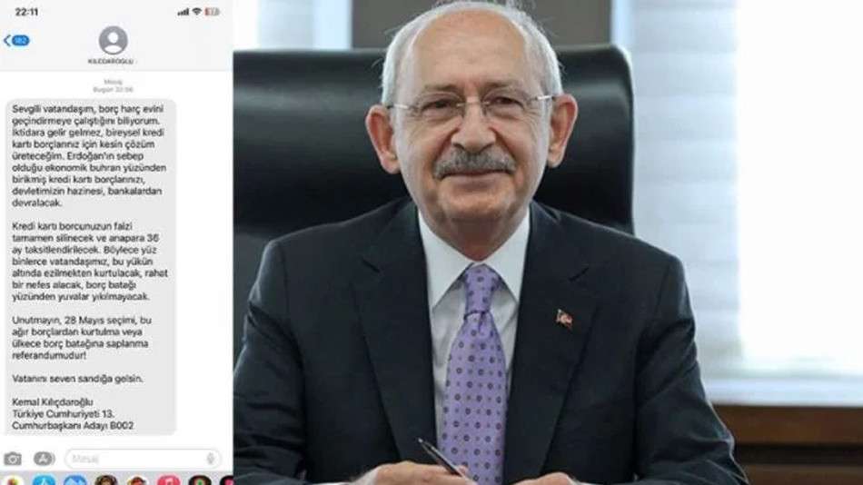 Millet İttifakı Cumhurbaşkanı adayı Kemal Kılıçdaroğlu, yurttaşlara “kredi kartı borçlarınızı, devletimizin hazinesi, bankalardan devralacak” şeklinde SMS göndermişti.