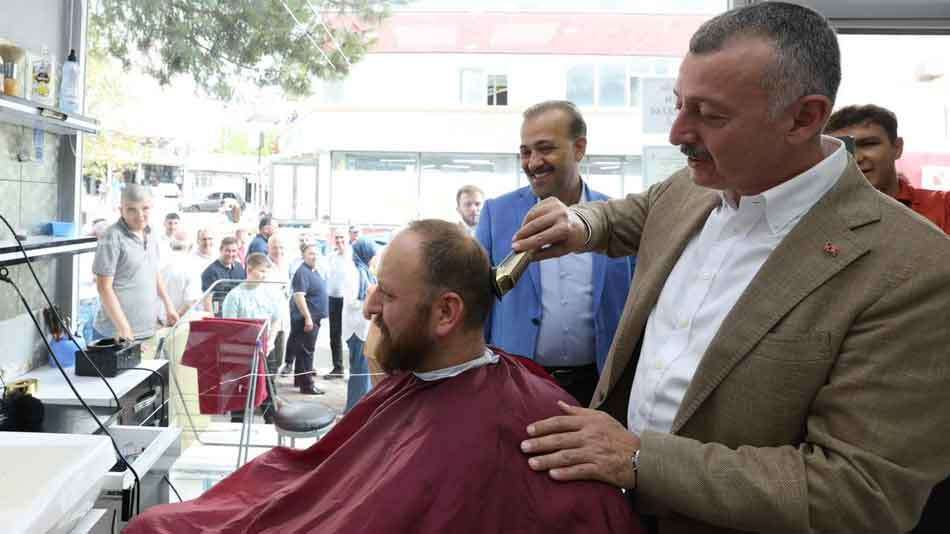 Esnafları da iş yerlerinde ziyaret eden Başkan Büyükakın bir berber dükkanında key,fli anlar yaşadı. Berberin elindeki saç kesme makinesini eline alan Büyükakın, saç traşı olmak için berber koltuğunda oturan Gebzeli vatandaşın saçlarını kesmeye devam etti..
