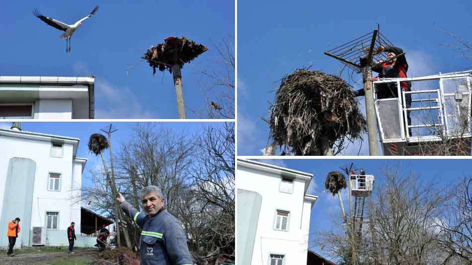 Rüzgârın etkisiyle yan yatan direk, yerinden sökülüp sağlam bir şekilde yeniden monte edildi. Ayrıca direğin üzerine kurulu olan leylek yuvası da dikkatle yerinden alındı. Eski yuvadaki dal parçaları temizlenerek, yeni yuva özenle yerine yerleştirildi. Onarım ve temizlik çalışmalarının ardından leylek yuvası yeniden kullanıma sunuldu. Yuvasına konan leylekler, yaşam alanlarına yerleşti.