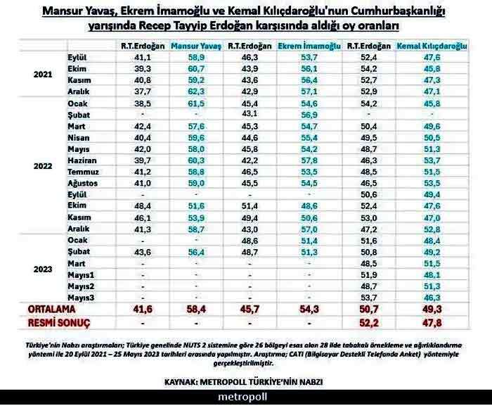 Metropoll araştırma şirketi 1 Eylül 2022 ile Mayıs 2023 arasında yaptığı 22 cumhurbaşkanlığı anket sonuçlarını paylaştı.