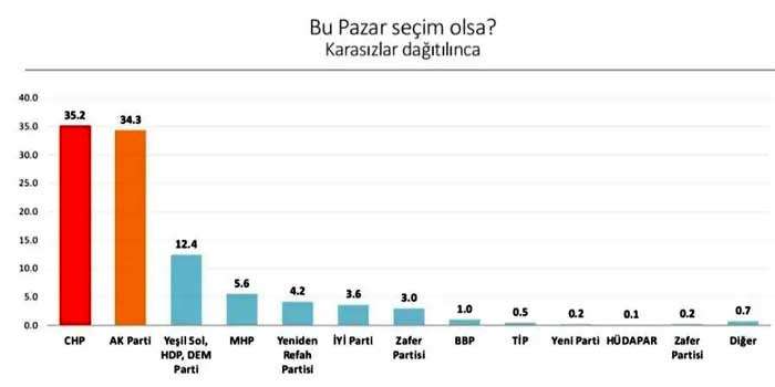 Kararsızlar, fikir belirtmeyenler ve oy kullanmayacağını söyleyenlerin oyları aritmetik dağıtıldığında ise CHP yüzde 35,2'lik, AKP ise yüzde 34,3'lik oy oranına ulaşıyor. Üçüncü sırada yüzde 12,4 ile DEM Parti, dördüncü sırada yüzde 5,6 ile MHP, beşinci sırada yüzde 4,2 ile Yeniden Refah Partisi yer alıyor. İYİ Parti ve Zafer Partisi ise sırasıyla yüzde 3,6 ve yüzde 3'lük oy oranına ulaşıyor.