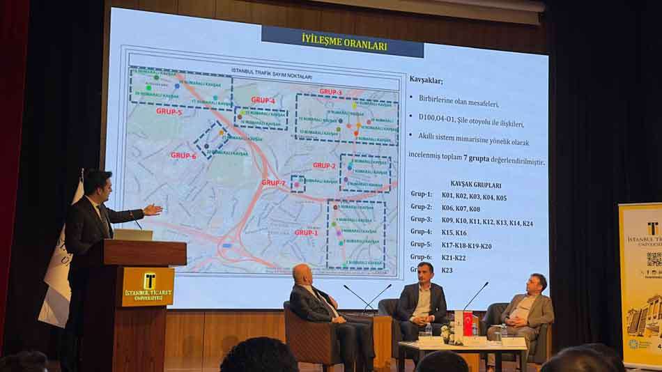 Prof. Dr. Ilıcalı, ASELSAN ve İBB temsilcilerinin katılımıyla düzenlenen panelde de projenin sonuçlarını paylaştı: 16 kavşakta gerçekleştirilen geometrik düzenlemeler, simülasyon çalışmaları ve kamera ve sensörlerin ayrı ayrı ve birlikte kullanıldığı adaptif sinyal sistemleri sayesinde aşağıdaki kazanımlar elde edildi: * %12 ila %59 arasında trafik iyileşmeleri sağlandı, Günde 5 bin 273 litre yakıt tasarrufu elde edildi. *Emisyon değerlerinde düşüş yaşandı. *Trafikte bekleme süresi ve kuyruklar minimize edildi.